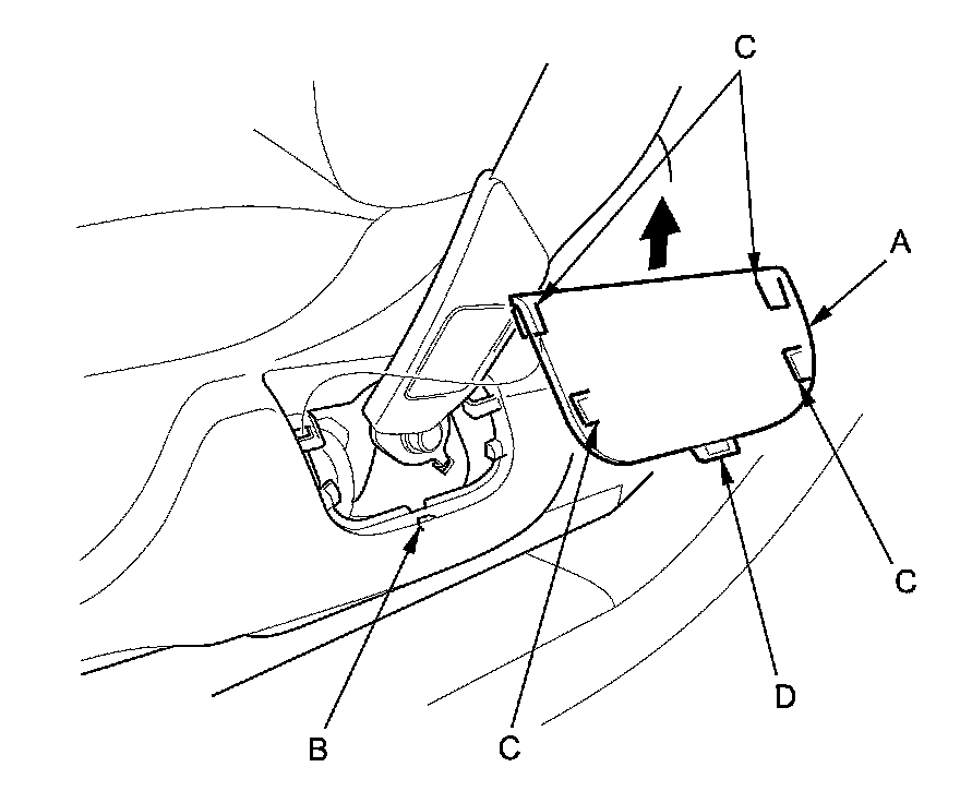 1. Slide the front seat all the way forward. Carefully pry up on the bottom of the anchor cover (A) at the pry point (B) with the appropriate trim tool to release the hooks (C) and the tab (D), then remove the cover by pulling it upward. The driver's seat is shown; the passenger's seat is similar.