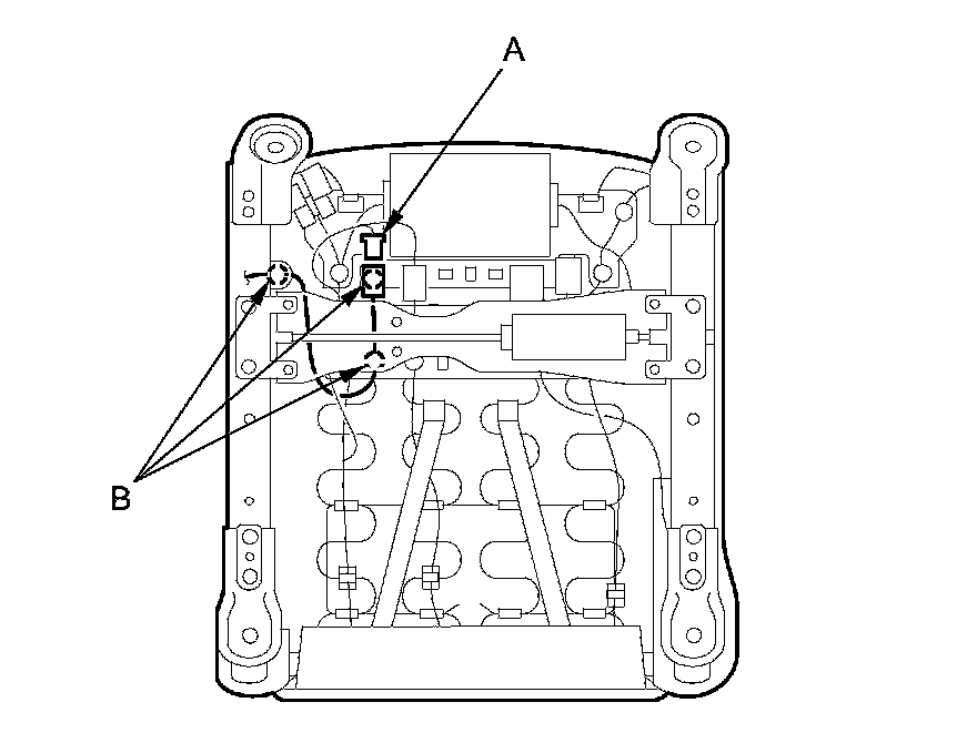 3. Lift up the front seat, disconnect the seat belt buckle switch connector (A), then detach the harness clips (B).