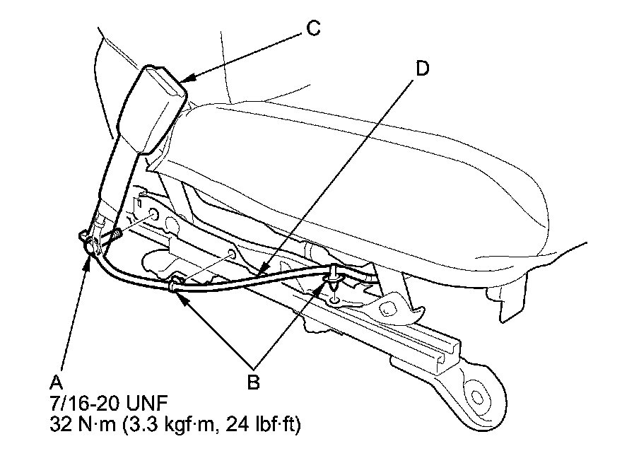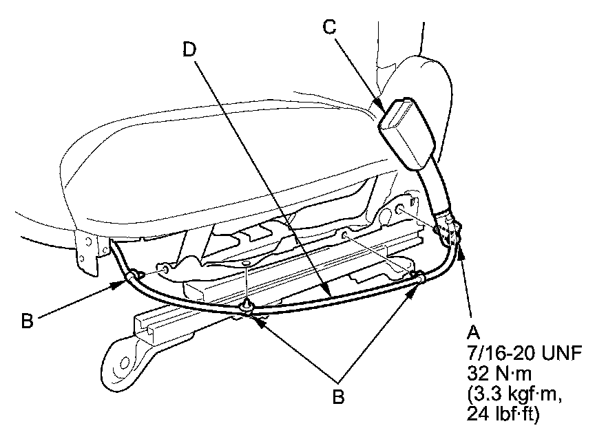 5. Pull out the seat belt buckle switch harness (D) through the space between the seat cushion and the seat track.