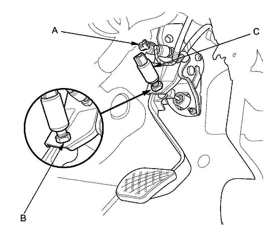 2. Loosen the locknut (B), then remove the clutch pedal position switch B (C).