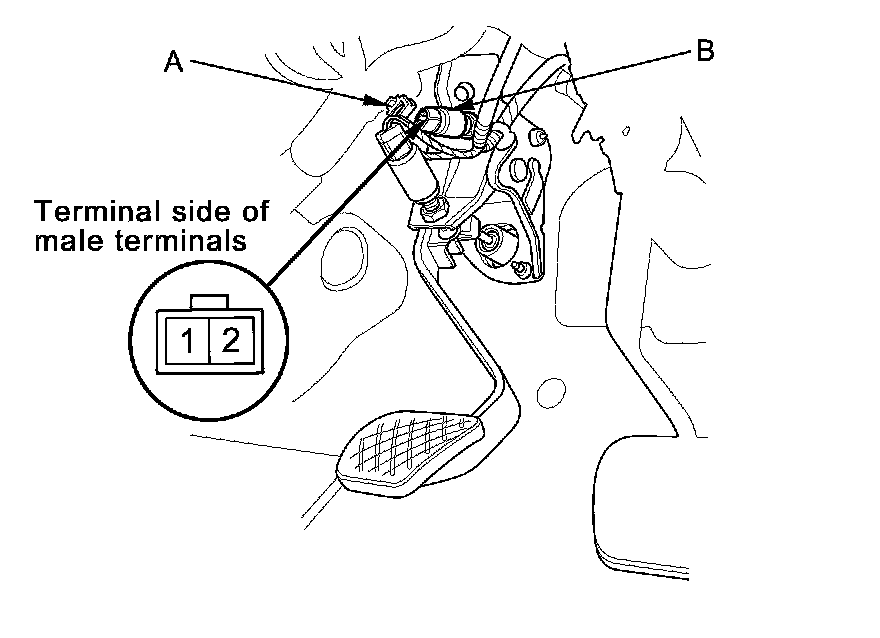 - If OK, install the clutch pedal position switch A and adjust the pedal height Adjustments.