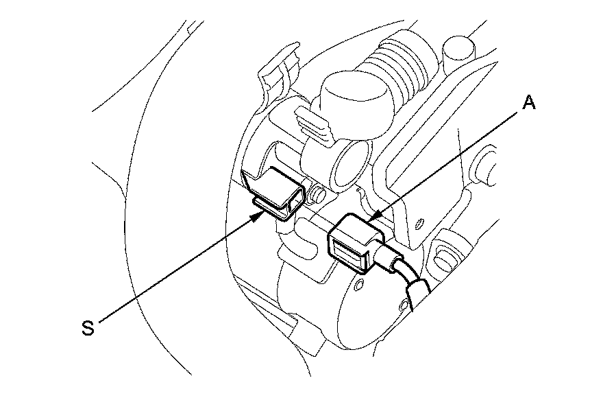 11. Make sure the shift lever is in neutral (M/T model) or N or P (A/T model), then disconnect the connector (A) from the starter S terminal. Connect a jumper wire from the battery positive terminal to the S terminal.
