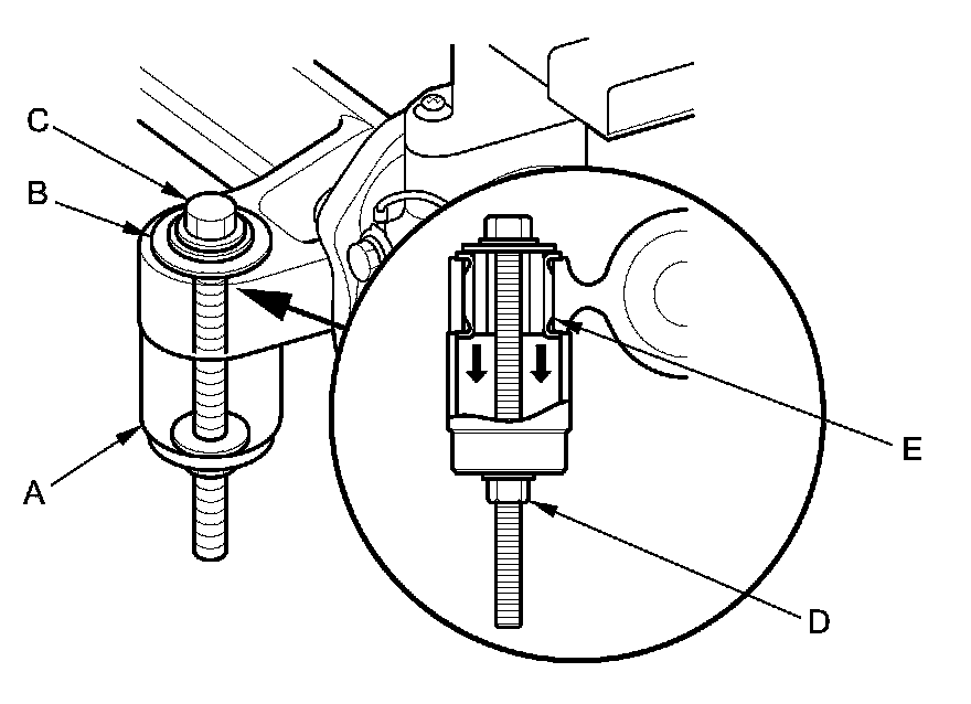3. Hold the flange bolt with a wrench, and tighten the nut with a wrench. Remove the gearbox mount cushion (E).