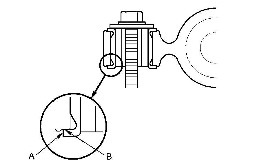 6. Install the gearbox mount cushion by tightening the nut until the mount cushion edge (A) properly fits on the gearbox flange surface (B).