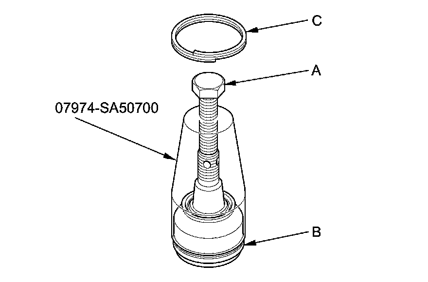 8. The front upper arm ball joint: Adjust the clip guide with the adjusting bolt (A) until its base is just above the groove around (B) the bottom of the boot. Then slide the clip (C) over the clip guide and into position on the boot.