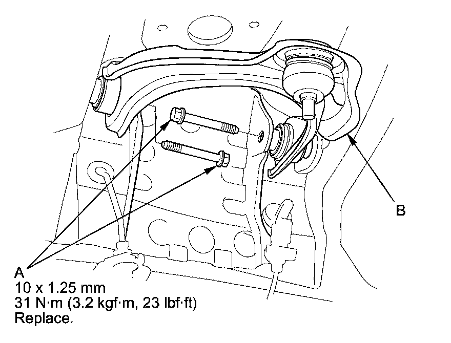 6. Remove the upper arm mounting bolts (A), then remove the upper arm (B).