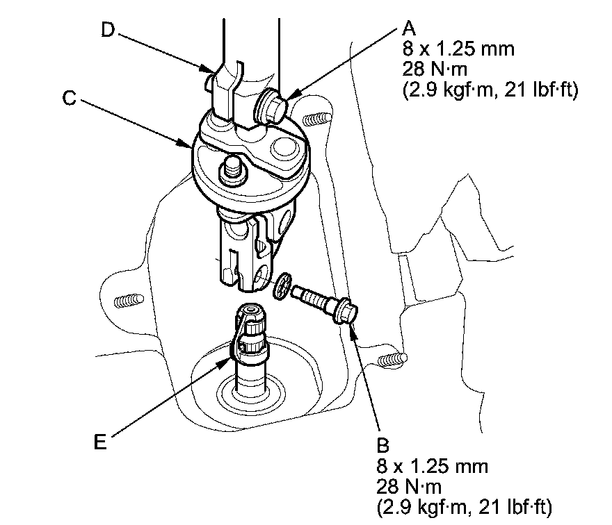 12. Loosen the upper steering joint bolt (A), and remove the lower steering joint bolt (B). Disconnect the steering joint (C) by sliding the steering joint into the column shaft (D). Tighten the steering joint upper bolt to hold the column shaft.