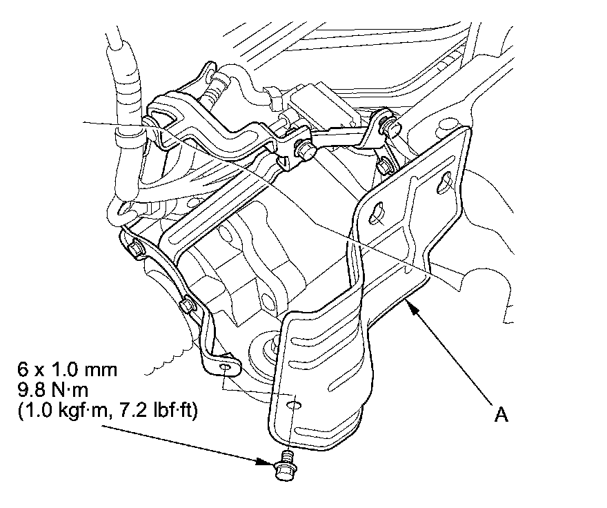 24. Remove the flange bolts, and remove the front subframe stiffener (A).