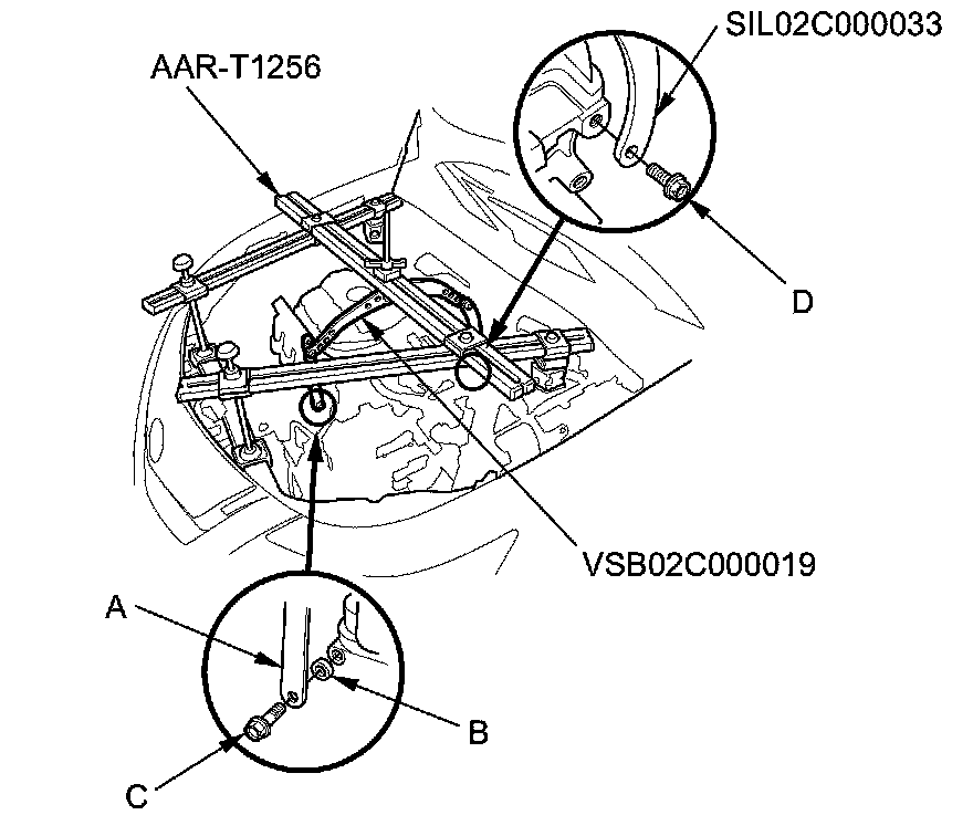 17. Lift and support the engine with the engine support hanger (AAR-T1256) and the engine hanger balance bar (VSB02C000019). Attach the front arm (A) to the front cylinder head with a spacer (B) and a 10 x 1.25 mm bolt (C). Remove the rear arm from the engine hanger balance bar, and install the 2008 V6 attachment arm (SIL02C000033), then attach the 2008 V6 attachment arm to the rear cylinder head with a 8 x 1.25 mm bolt (D).