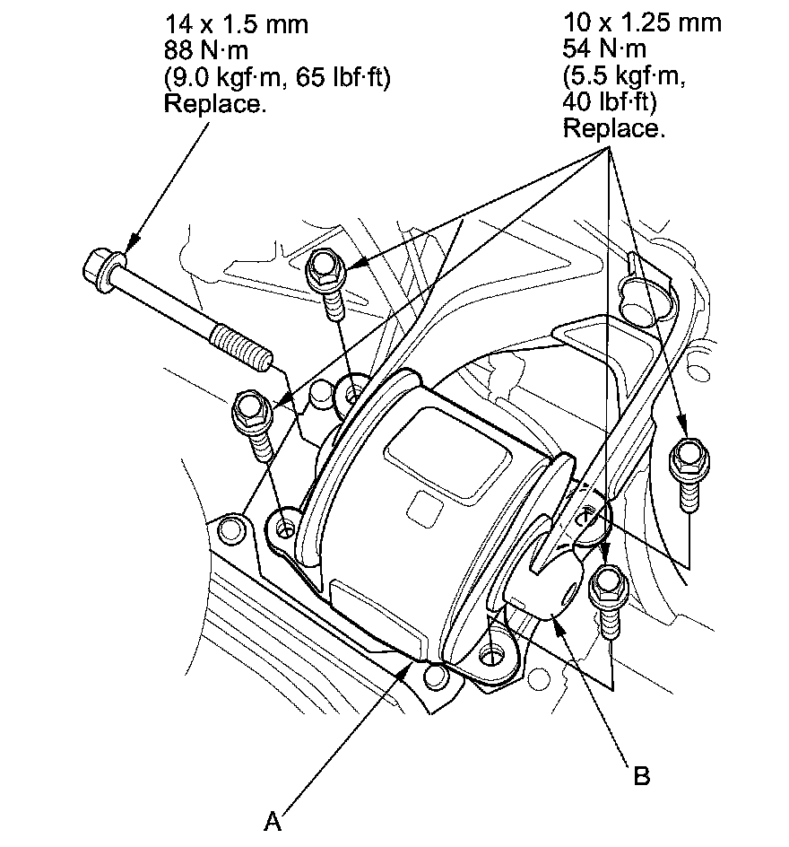 19. M/T: Remove the rear engine mount bolts from the rear engine mount (A) and the rear engine mount bracket (B).