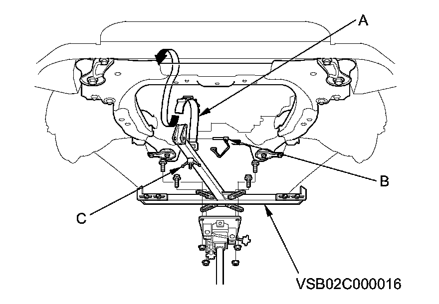 29. Attach the subframe adapter (VSB02C000016) to a transmission jack, then raise up the jack to the subframe. Hang the belt (A) over the front of the subframe, then secure the belt by inserting the stop (B) and then tighten the wing nut (C).