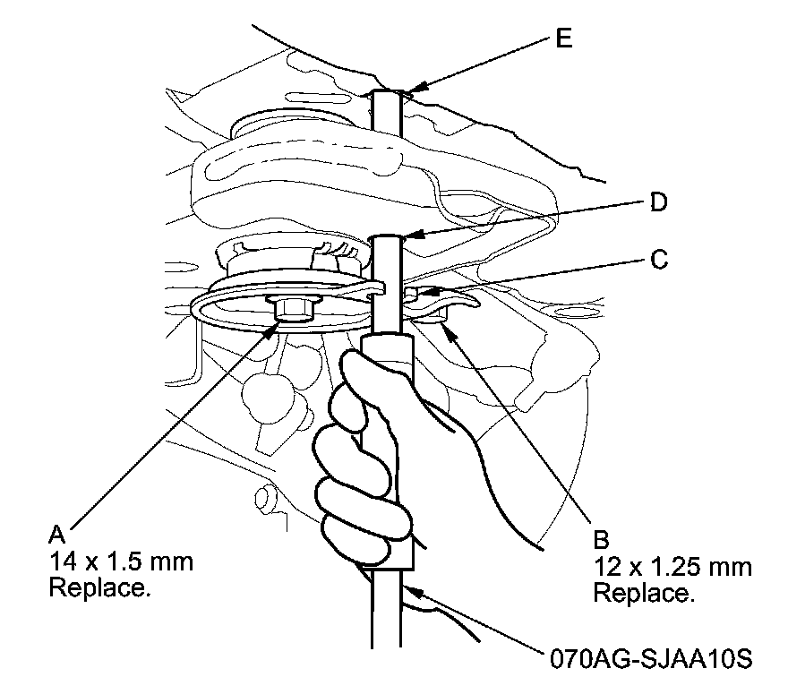 38. Loosely install the new right rear subframe mounting bolt (A) and the new stiffener mounting bolt (B); insert the 15.7 mm side of the subframe alignment pin (070AG-SJAA10S) through the positioning slot (C) on the rear stiffener, through the positioning hole (D) on the front subframe, and into the positioning hole (E) on the body, then tighten the right rear subframe mounting bolt.