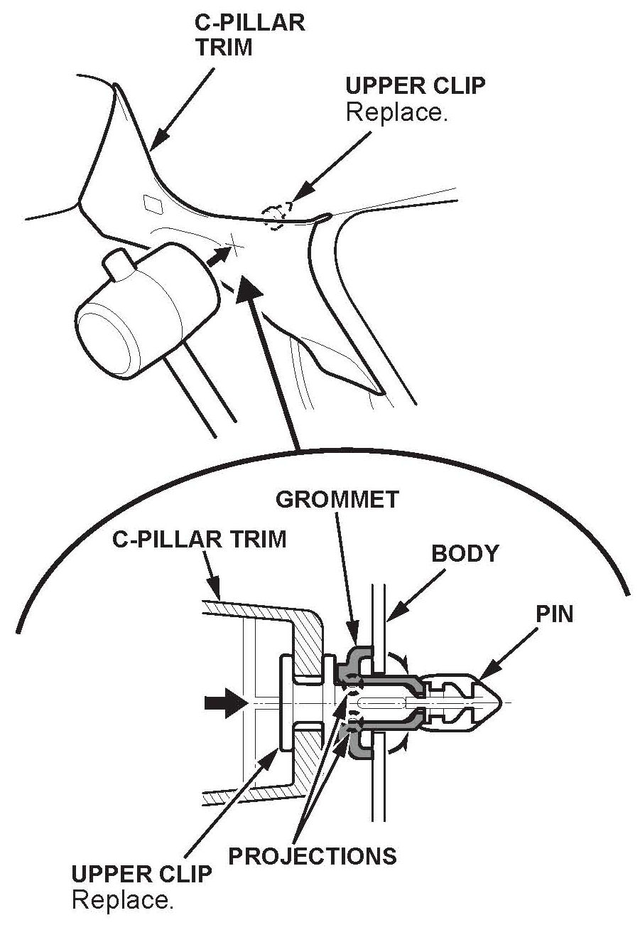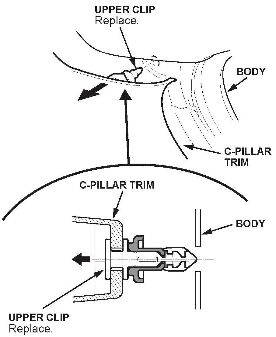 The upper clip must be replaced with a new one when the C-pillar trim is reinstalled.