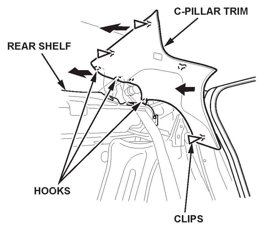 9. Pull the C-pillar trim by hand to detach the clips to release the hooks, then pull out the trim from the rear shelf.