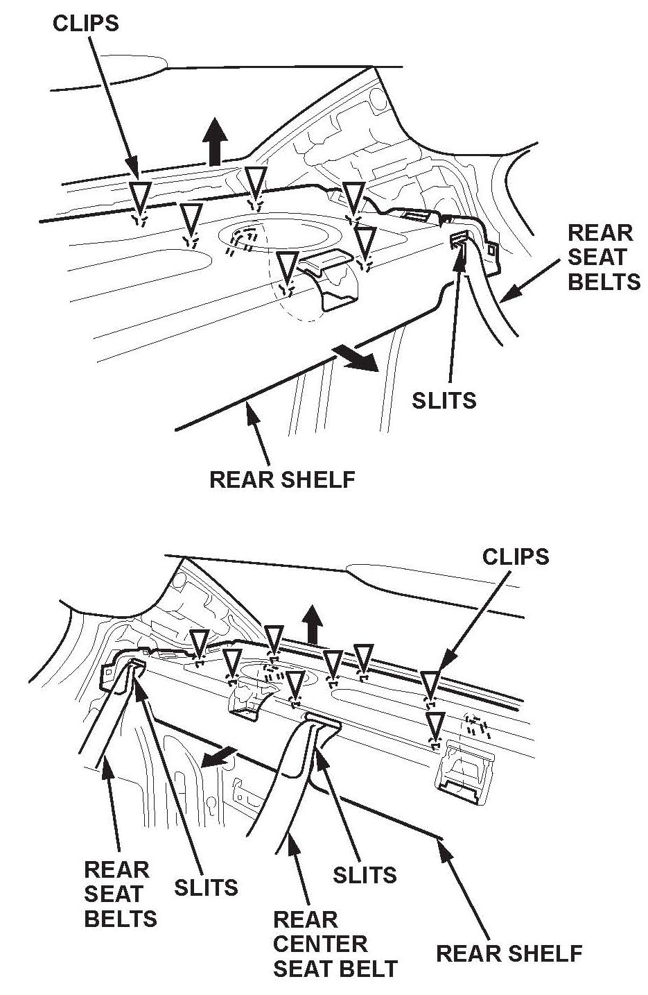 ^ Pull both rear seat belts and the rear center seat belt out through the slits in the rear shelf.
