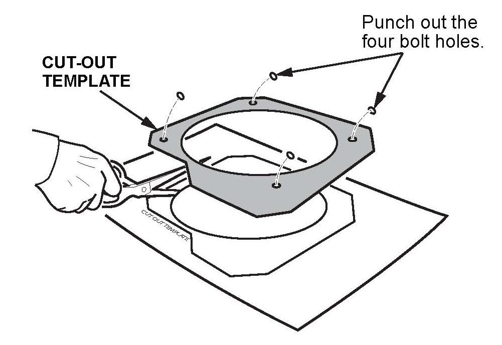 14. Cut out the paper template provided in the kit. Punch four holes in the template where the subwoofer mounting bolts go through.
