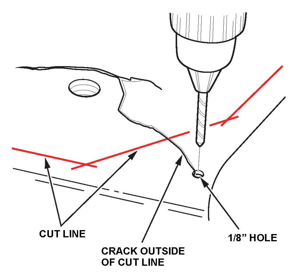17. Inspect the rear shelf for cracking that may extend past the cut line. If any crack extends beyond the cut line, drill an 1/8" hole into the end of the crack. Fill the hole and crack with J-B Weld.