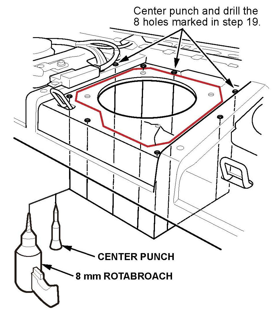 21. Use a center punch on each marked hole to prepare the surface for drilling.