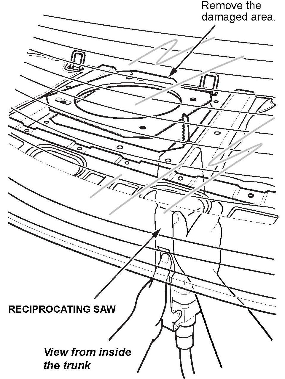 23. Using a reciprocating saw with a 4 mm wide blade with 24 TPI, cut along the inside of the cut line made in step 16 to remove the damaged area of the rear parcel shelf.