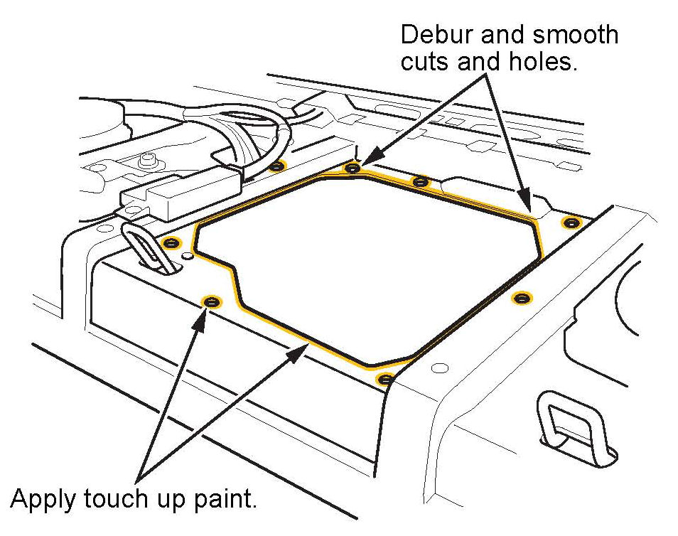 26. From inside the trunk, install the service plate to the bottom side of the rear shelf. Install the bolts from the top side of the rear shelf and into the service plate. Bolts should be hand tight.