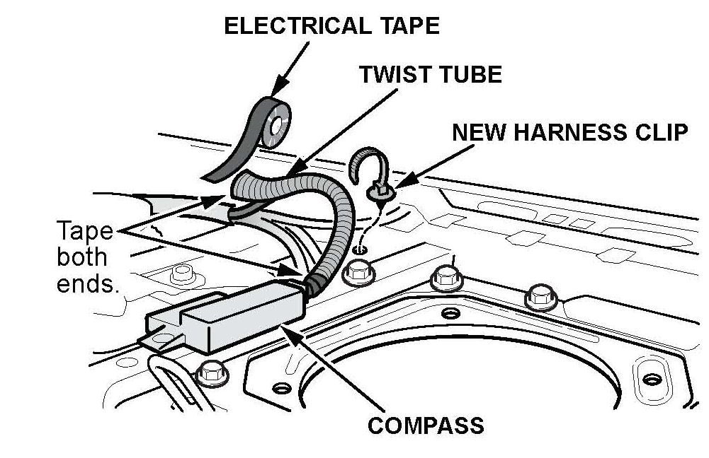 31. If equipped, remove the compass harness and clip from its current location. Apply the twist tube from the kit around the compass harness to protect it from bolt damage.