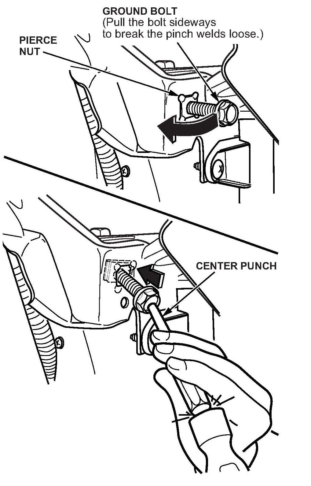 ^ Break two pinch welds by pulling the bolt to the driver's side of the vehicle.