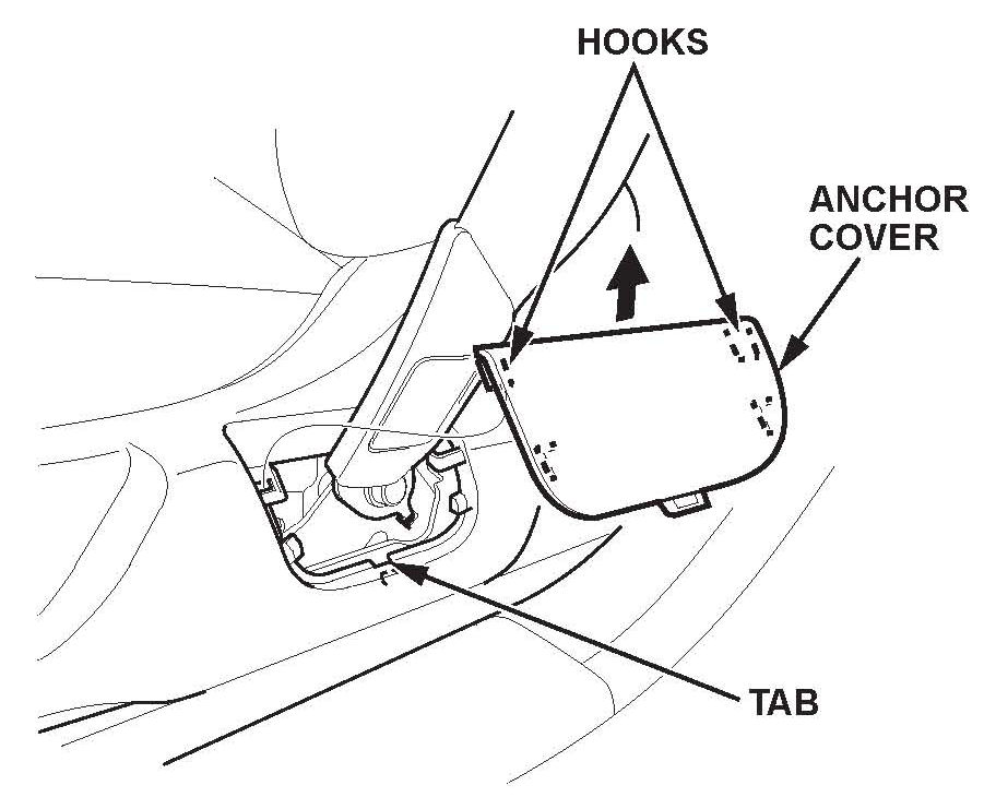 3. Slide the driver's seat all the way forward. Carefully pry up on the bottom of the anchor cover using the appropriate trim tool to release the hooks and tab.