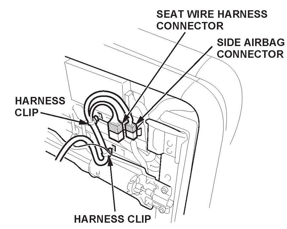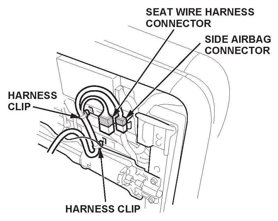 30. Reconnect the side airbag connector, the seat wire harness connector, and the harness clips.