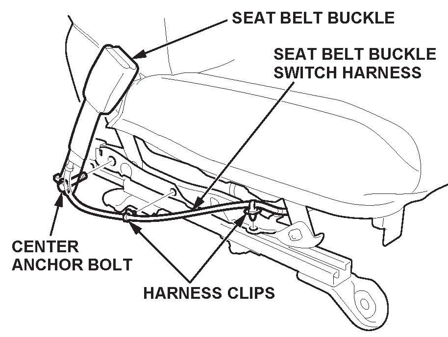 14. Remove the dnver's seat belt buckle center anchor bolt, then remove the buckle. Detach the three harness clips.