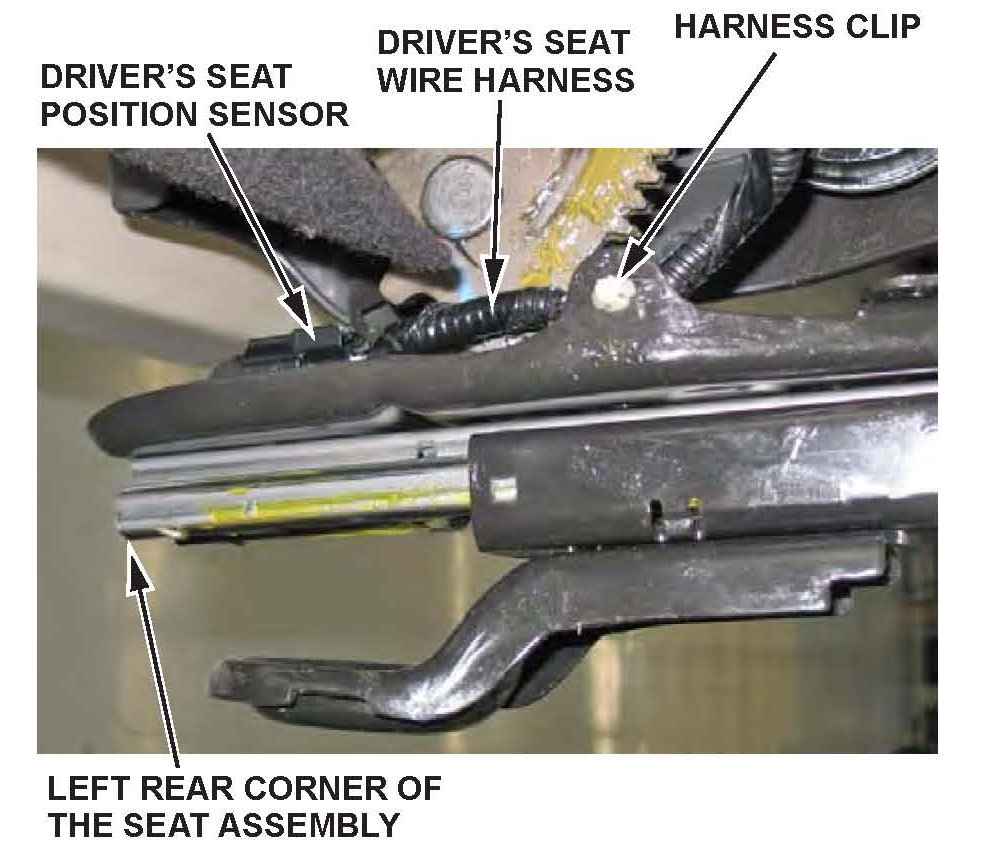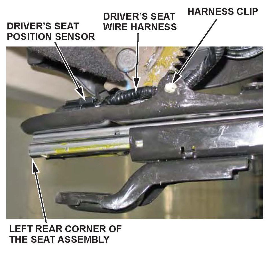 17. At the left rear corner of the seat assembly, disconnect the driver's seat position sensor connector, and detach the harness clip.