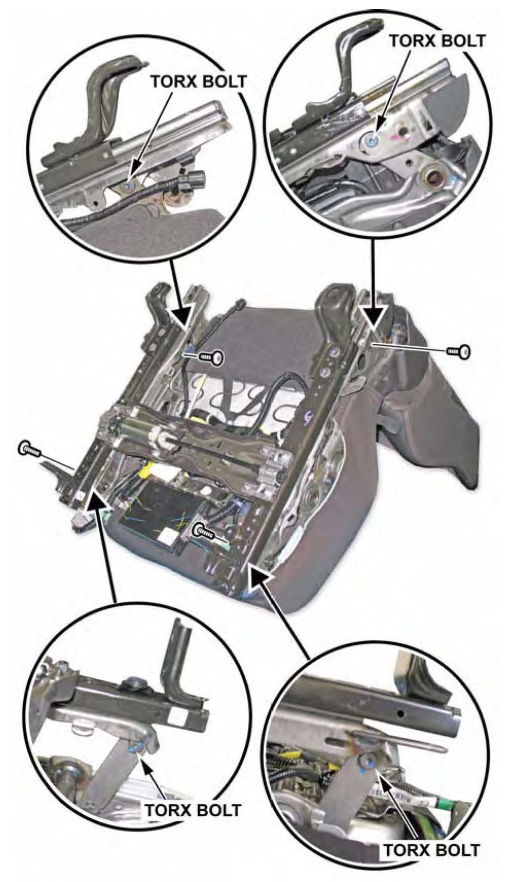 18. Remove the TORX bolts from each corner of the seat rail assembly. Discard the bolts.
