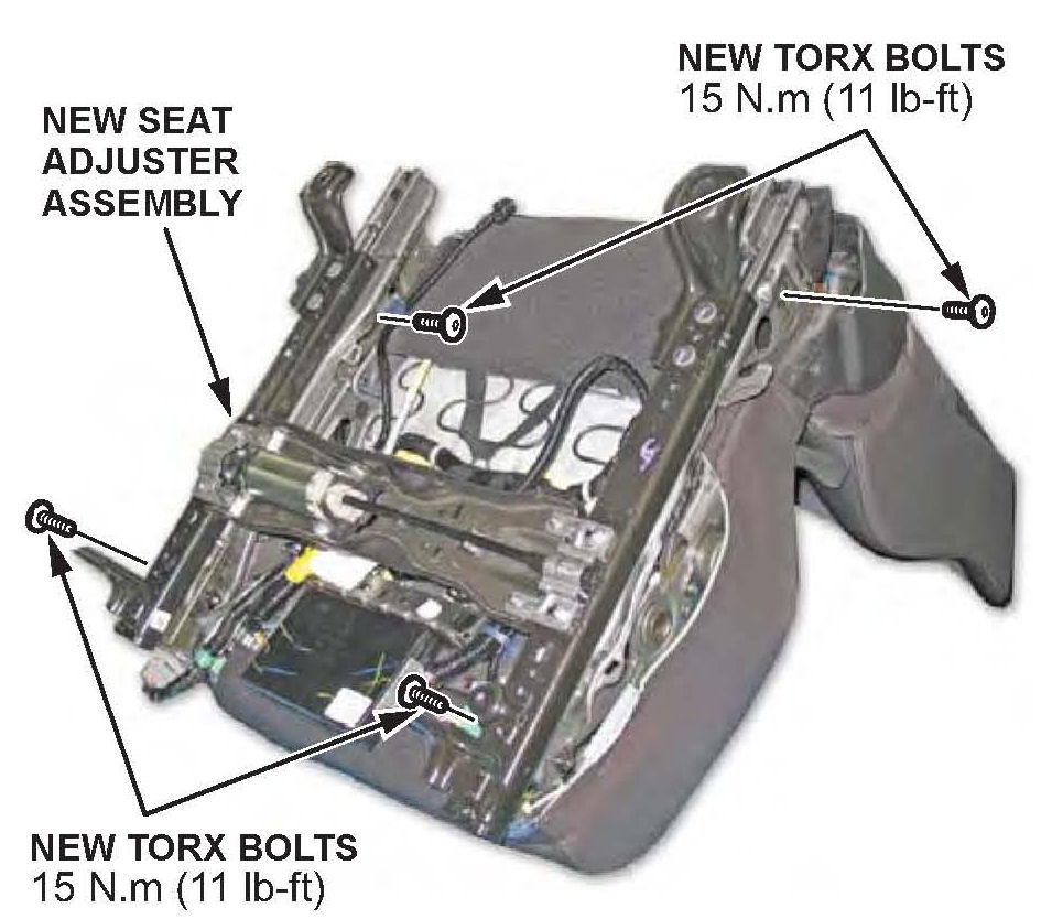 21. Loosely install the new seat rail assembly onto the seat with four new TORX bolts, then torque the bolts to 15 Nm (11 lb-ft)
