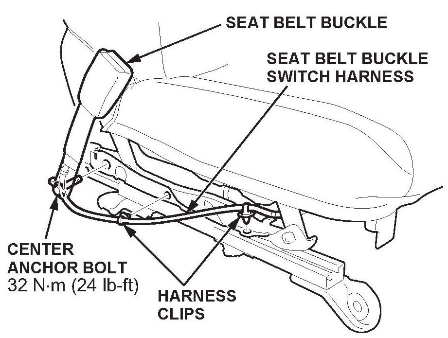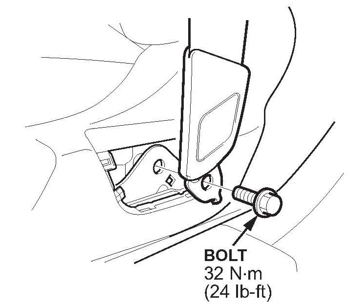 26. Reattach the seat belt buckle, and torque the center anchor bolt to 32 N.m (24 lb-ft).