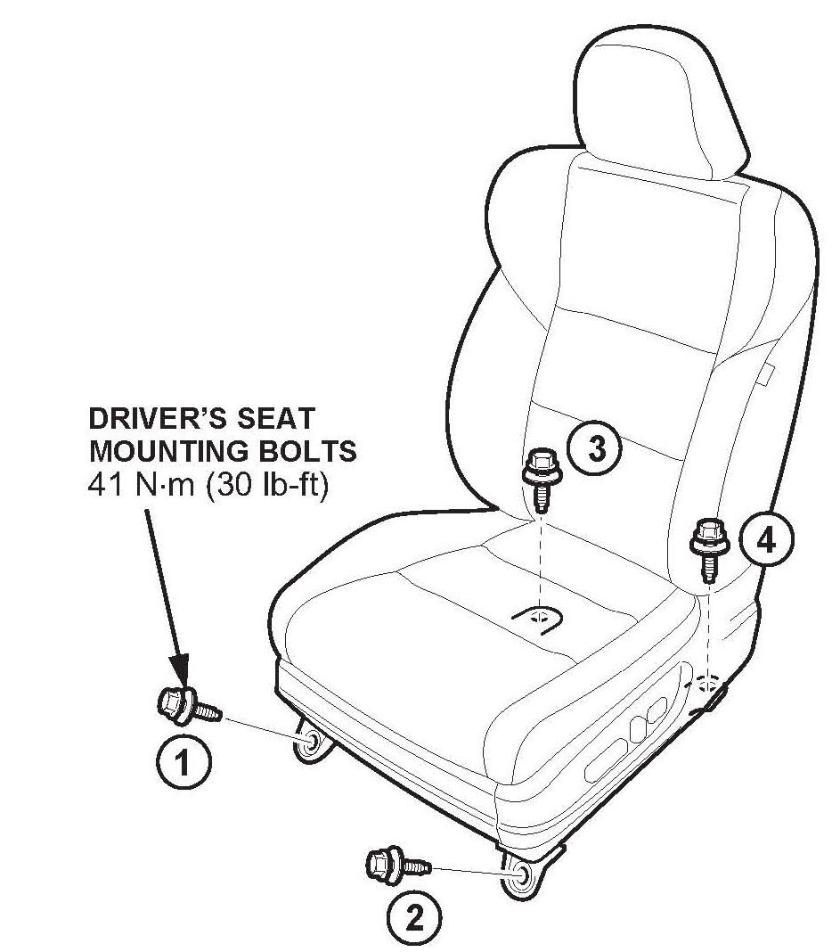 32. Install the driver's seat mounting bolts, and torque them in the sequence shown to 41 N.m (30 lb.ft).