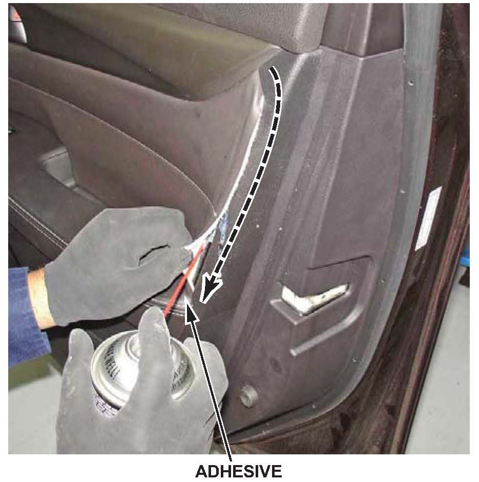 3. Spray a bead of adhesive under the entire length of the door panel fabric.