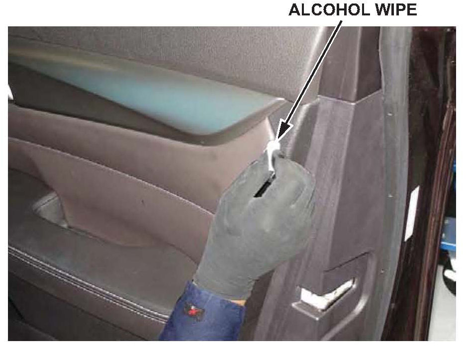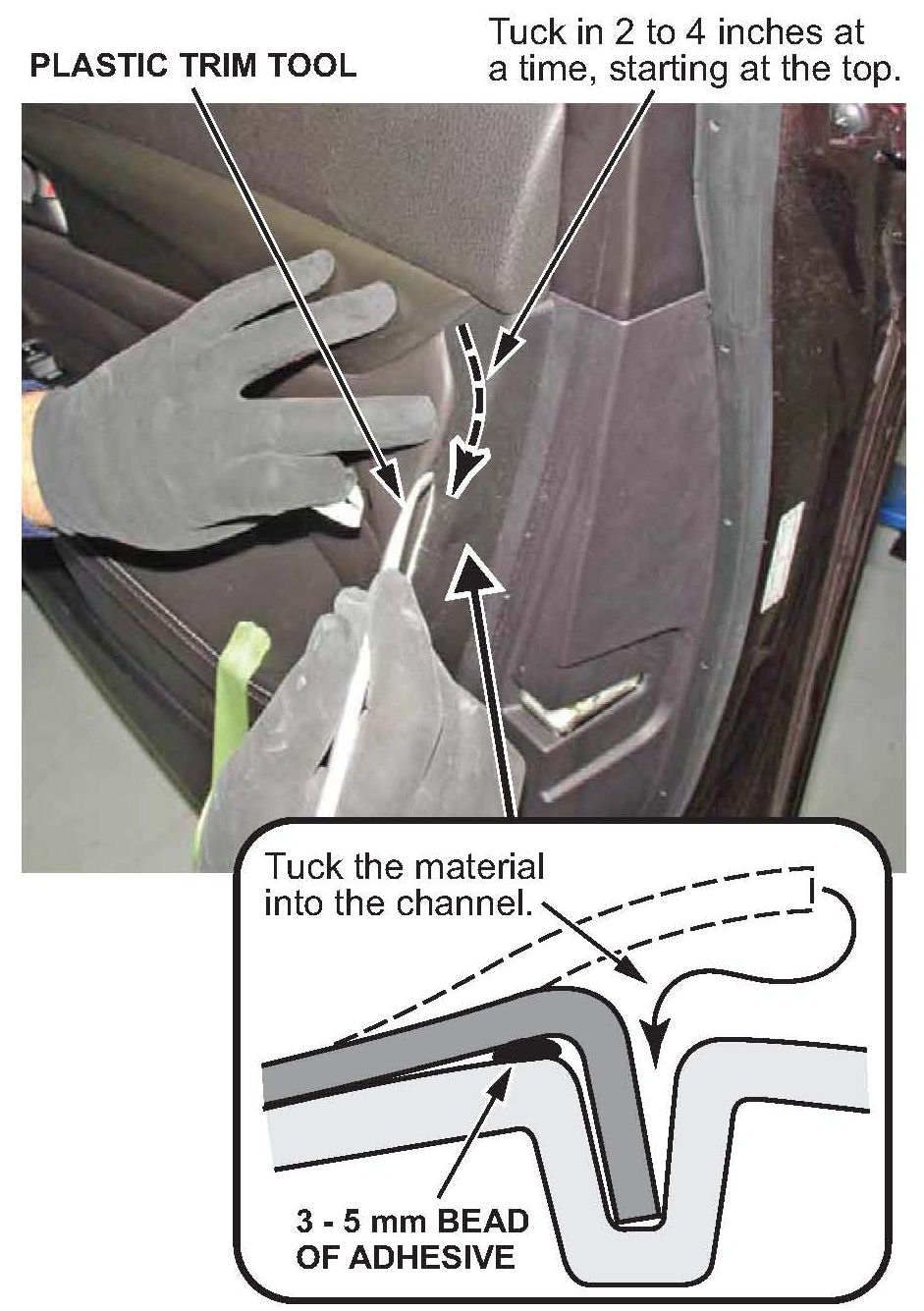 5. As you tuck the fabric into the channel, wipe off any excess adhesive on the outer portion of the door panel with isopropyl alcohol. Do not allow the adhesive to dry on the panel; this will permanently damage the panel.