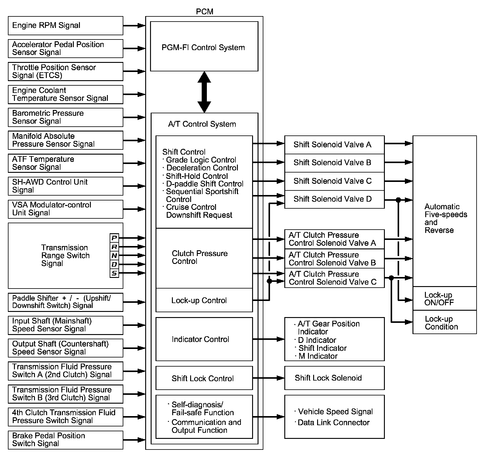 The PCM receives input signals from the sensors, switches, and other control units, processes data, and outputs signals for the engine control system and A/T control system. The A/T control system includes shift control, clutch pressure control, and lock-up control. The PCM switches the shift solenoid valves and the A/T clutch pressure control solenoid valves on and off in a specific sequence to control gear selection and torque converter clutch lock-up.