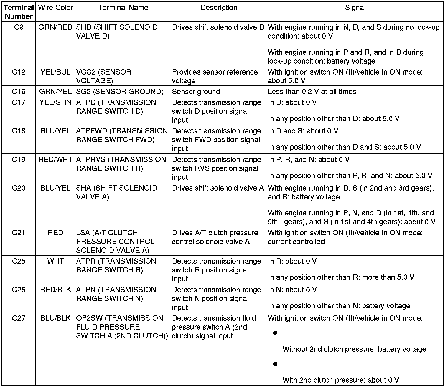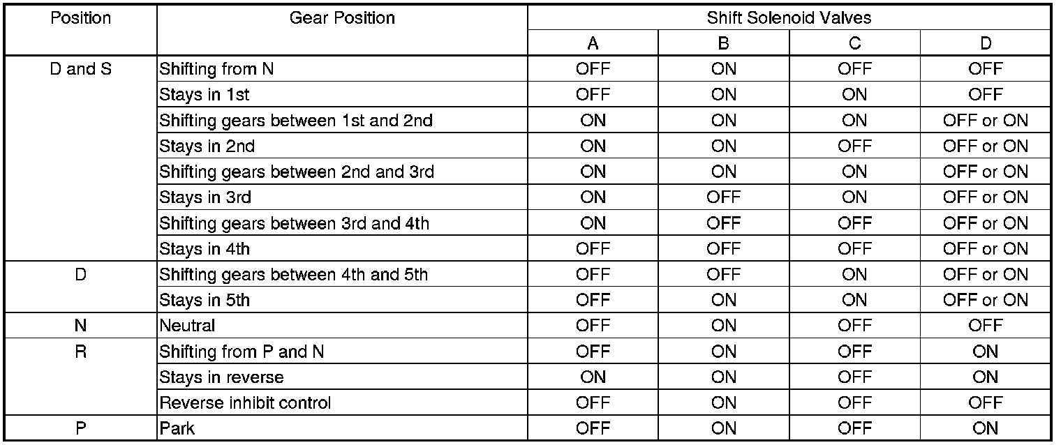 The combination of driving signals to shift solenoid valves A, B, C, and D for each gear are in the following table.
