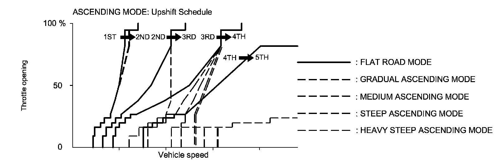 The PCM monitors the average change in vehicle speed and throttle over time. When these values exceed those for normal driving conditions, the shift-up from 3rd to 4th gear and 4th to 5th gear is delayed. This gives more control over power, and engine braking. The transmission resumes the normal shift-up pattern after the PCM determines that normal driving has resumed.