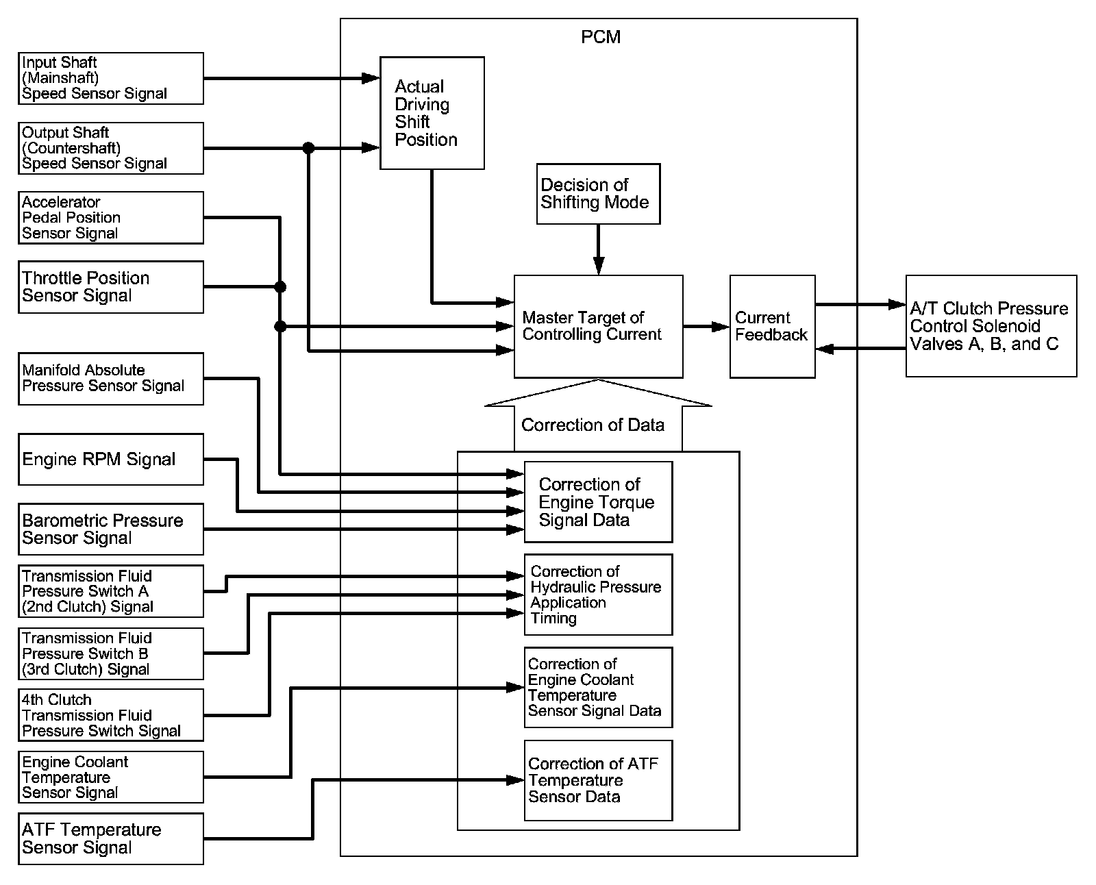 The PCM actuates A/T clutch pressure control solenoid valves A, B, and C to control the clutch pressure. When shifting between gears, the clutch pressure regulated by A/T clutch pressure control solenoid valves A, B, and C engages and disengages the clutch smoothly.