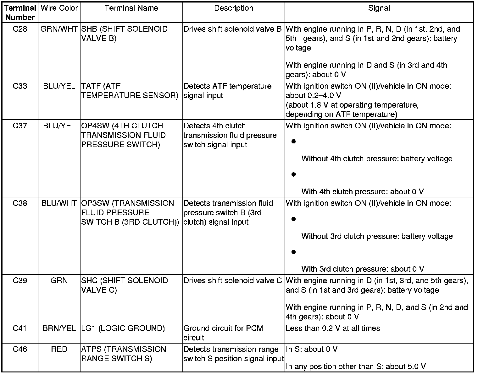 PCM A/T Control System Inputs and Outputs at Connector C (circle) (49P)