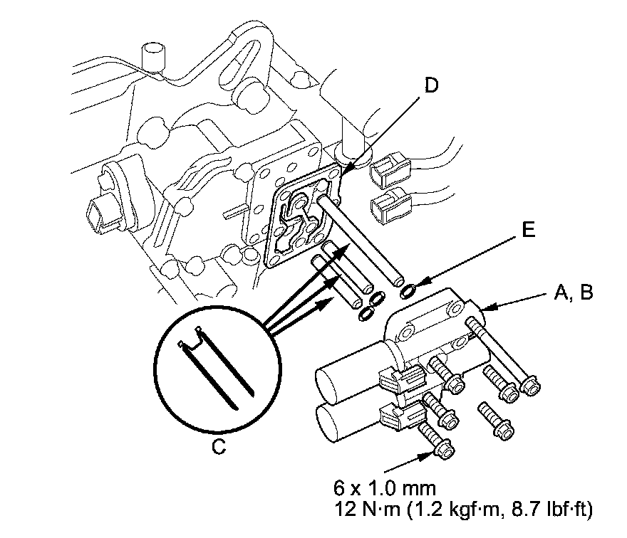 9. Remove A/T clutch pressure control solenoid valves A and B, the ATF pipes (C), the gasket (D), and the O-rings (E).