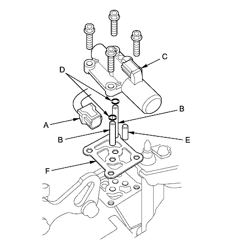 4. Remove A/T clutch pressure control solenoid valve C, the ATF joint pipes (B), the O-rings (D), the ATF pipe (E), and the gasket (F).