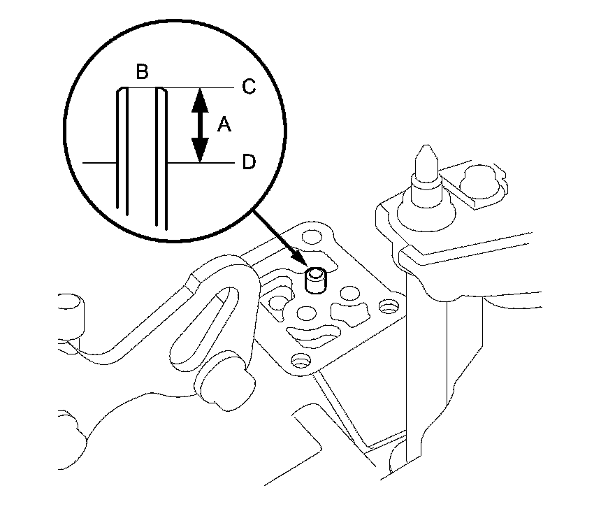 7. Check the height (A) of the 8 x 53 mm ATF joint pipe (B) between the top (C) of the pipe and the solenoid valve body mounting surface (D). The height is about 7.0 mm (0.28 in). If the height is over 7.0 mm (0.28 in), push the pipe until it bottoms in the accumulator body.