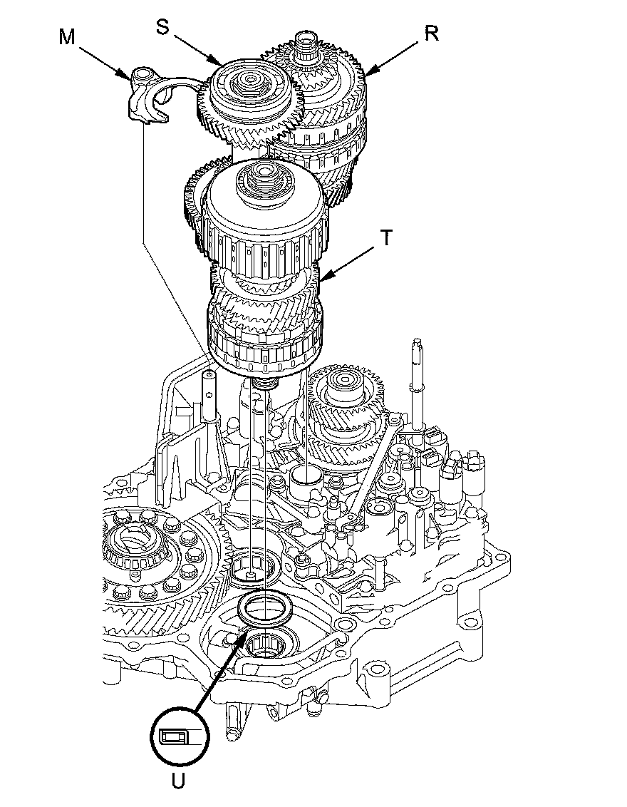 29. Remove the mainshaft (R), the countershaft (S), the shift fork (M), and the secondary shaft (T) together, and remove the needle bearing (U) from the torque converter housing.