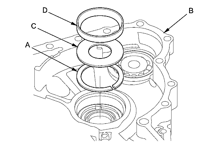 3. Install the spacer (C) and the bearing outer race (D) in the transmission housing.