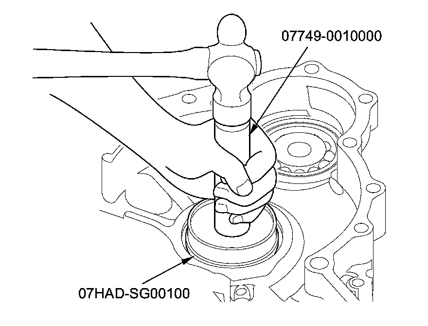 4. Drive the bearing outer race securely in the transmission housing using the driver handle and the 83 mm attachment so there is no clearance between the bearing outer race, the spacer, the 85 mm thrust shim, and the transmission housing.