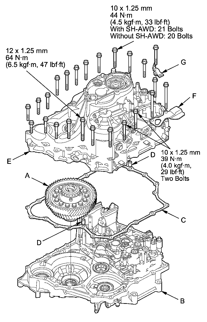 6. Install the transmission housing (E), and install the mounting bolts (with SH-AWD: 24 bolts, without SH-AWD: 23 bolts) with the transmission hanger (F) and the ground terminal bracket (G), then tighten the bolts to the specified torque.