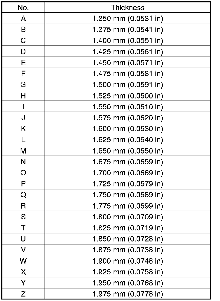 9. If the starting torque is out of the standard, remove the 85 mm thrust shim and select a new 85 mm thrust shim from the following table. Install a new 85 mm thrust shim, and recheck. To increase the starting torque, increase thickness of the 85 mm thrust shim. To decrease the starting torque, decrease the thickness of the 85 mm thrust shim.