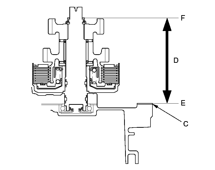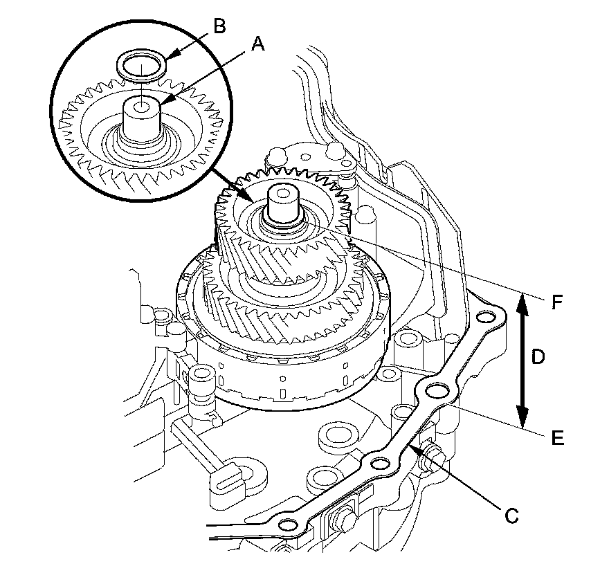 3. Measure the installed height (D) of the intermediary shaft between the surface (E) of the gasket and the surface of the 26.5 mm washer (F).